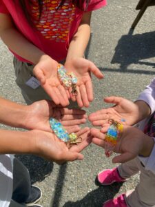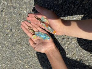 集めたマイクロプラスチックをハサミやニッパーで刻み、レジン(樹脂)を使用してキーホルダーを作ります。