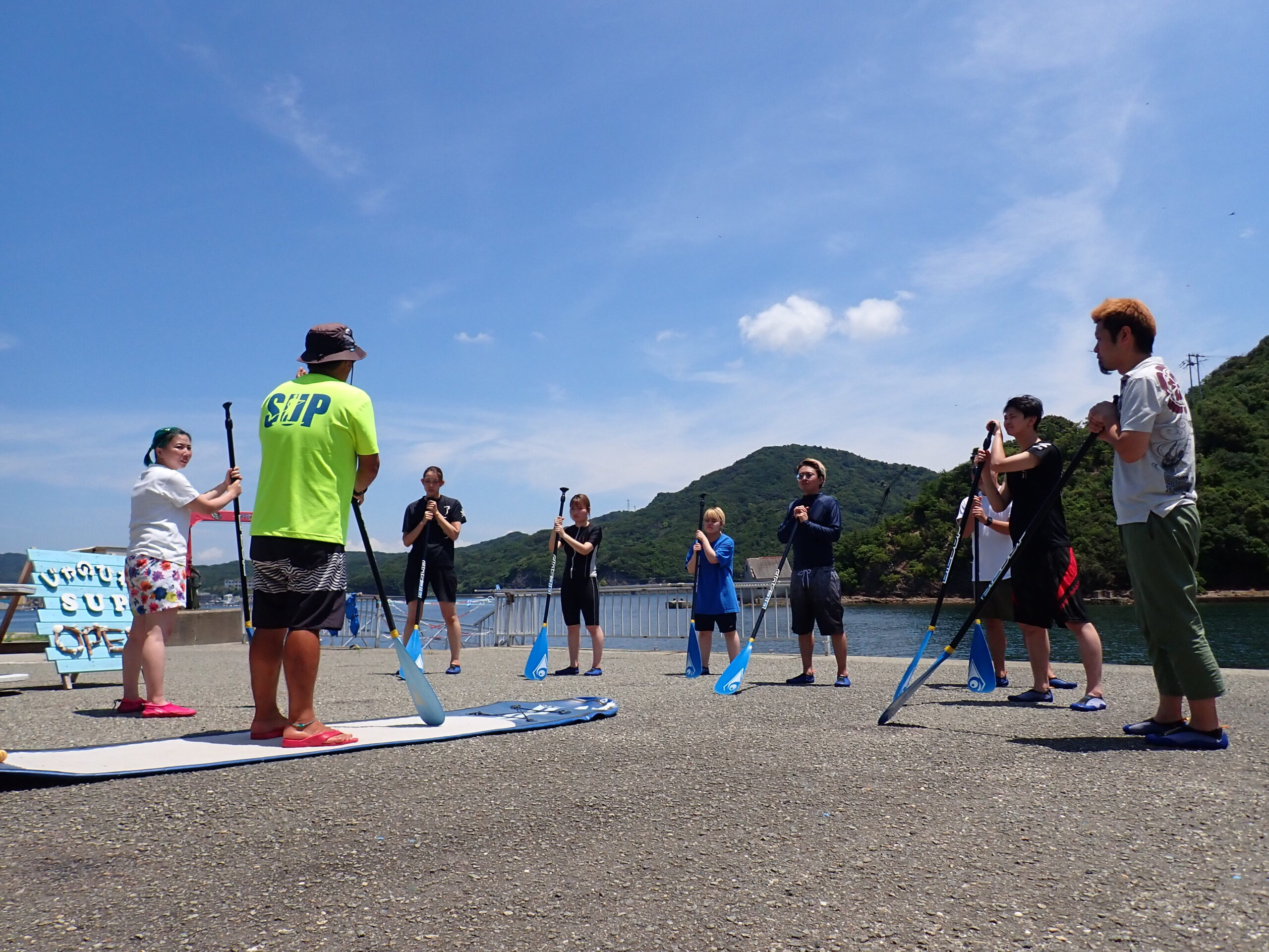 施設の前で、SUPの乗り方やパドルの使い方、体験時の注意点をお伝えいたします。